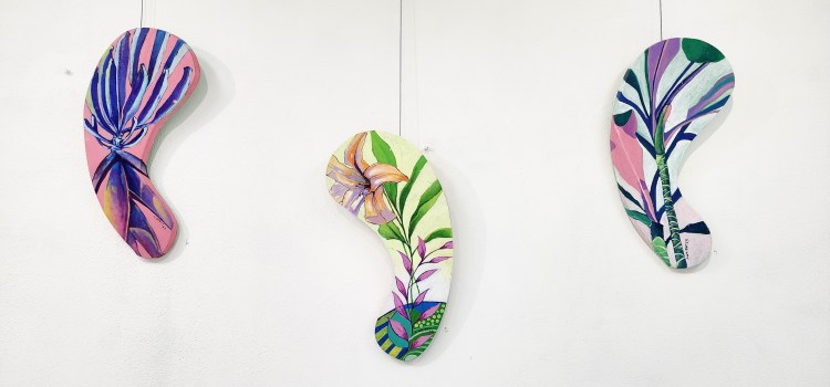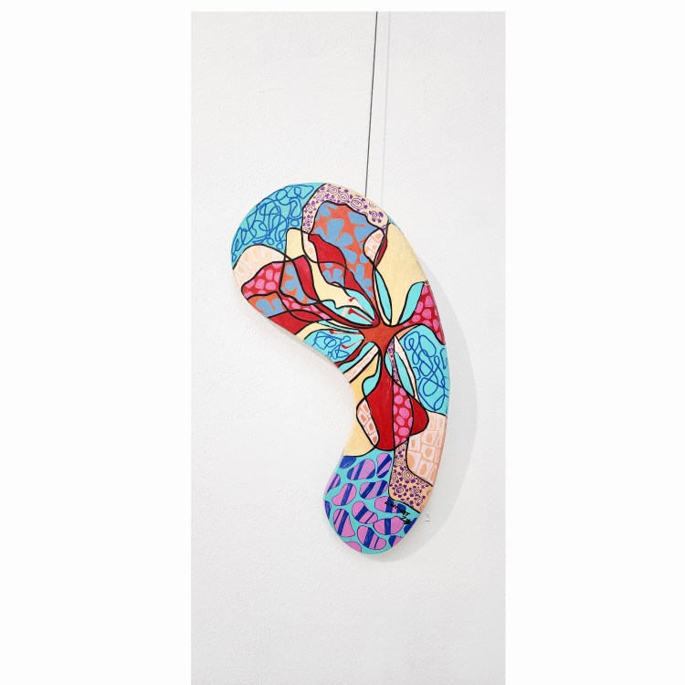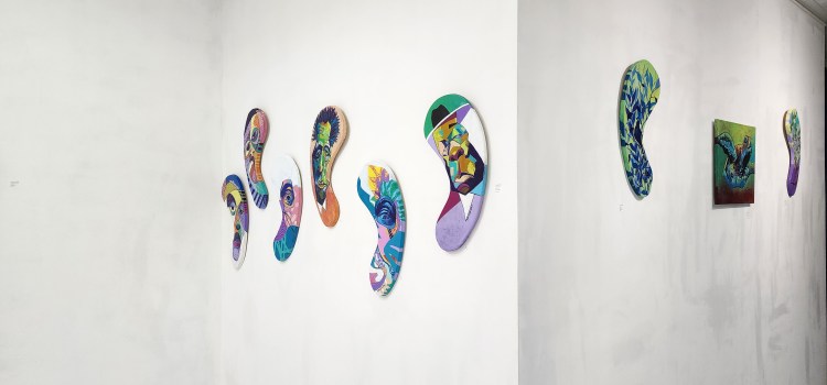 My materials and themes fluctuate, mimicking the web of realms. Each realm can call for a different material, different method of application of materials and diverse subject matters. Hence there is no set title for this show, but simply an observation of life’s revolving process of there is never one thing at a time.